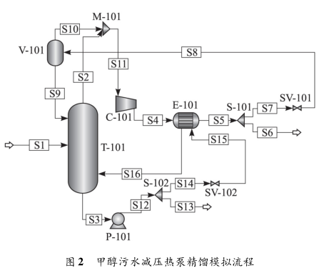 预处理后的甲醇污水由甲醇精馏塔( T-101) 中部进料,塔顶的低压蒸汽进入压缩机( C-101) 进行加压升温作为塔底再沸器( E-101) 的热源,经换热后自身冷凝为液态,一部分作为甲醇产品,另一部分经节流后进入塔顶气液分离罐( V-101 ) ,气相循环回 C-101 进口,液相作为塔顶回流入塔。塔底的一部分废水与塔顶的高温高压甲醇蒸汽在 E-101 中换热后气化作为塔底气相回流,另一部分废水直接出装置,如图 2 所示。