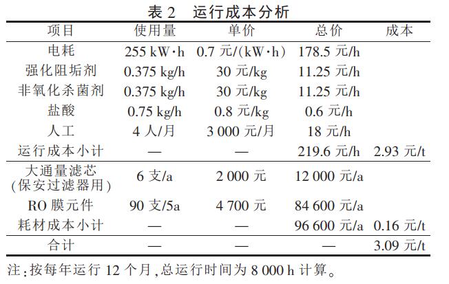 该工程处理浓水量为 75 m3/h,臭氧发生器功率为 150 kW,RO 系统所用水泵功率为 105 kW, 故电耗为 255 kW·h, 保安过滤器用大通量滤芯按 0.5 a使用寿命计算,则 1 a 使用 6 只,RO 膜元件按 5 a 使用寿命计算,折旧按 5 a 计算。 处理浓水的运行成本见表 2。