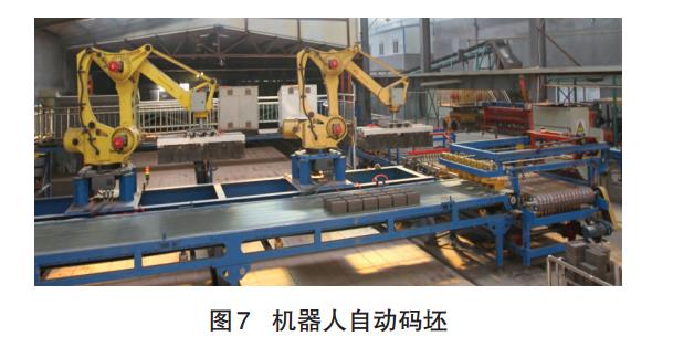 由双级真空挤出机挤出的泥条经数控切割成制品规格的坯体,然后由湿坯编组机对湿坯进行编组,再送入托盘转运机输送到上架机,指状叉车从上架机上将全部托盘取出,转运输送进大型室式干燥室里进行干燥,这个过程可以实现自动作业。干燥完成的砖坯由机器人按要求把砖坯码到窑车上,再进入隧道窑中进行焙烧(如图7所示)。