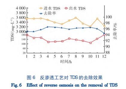 从图 6 可见,反渗透对 TDS 的去除率较高且比较稳定,当进水中 TDS 为 3 400 mg /L 左右时,出水TDS 均降至 180 mg /L 以下,去除率稳定在 94% 以 上。说明反渗透工艺是去除 TDS 的关键。