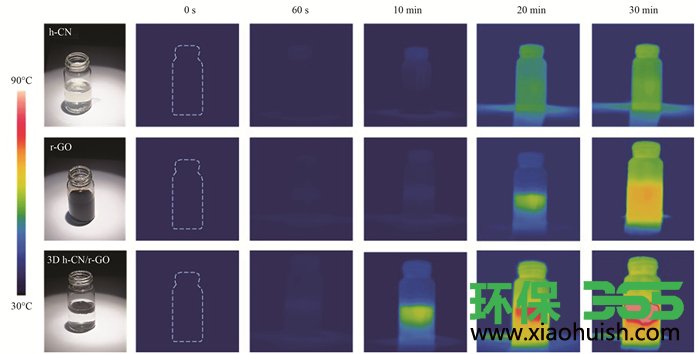 实验在室温为20℃, 湿度为50%条件下进行.分别投加等量的r-GO、h-CN和3D h-CN/r-GO, 调控水中NaCl含量为8%以模拟高盐条件.使用氙灯光源模拟太阳光照射, 维持光密度为1 kW·m-2.将装置放置于模拟太阳光照下, 分别记录0 s、60 s、10 min、20 min和30 min时刻材料的光热成像.