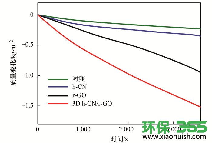 本实验在室温为20℃, 湿度为50%条件下进行.分别投加等量的r-GO、h-CN、3D h-CN/r-GO, 调控水中NaCl含量为8%以模拟高盐条件.使用氙灯光源模拟太阳光照射, 维持光密度为1 kW·m-2.将装置放置在天平上, 一旦模拟太阳光照射到样品上, 烧杯中的质量变化立刻在天平上记录下来, 水蒸发速率稳定条件下测试60 min.太阳能水蒸发性能由光蒸汽转化效率(η)进行评估.